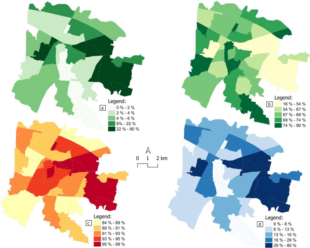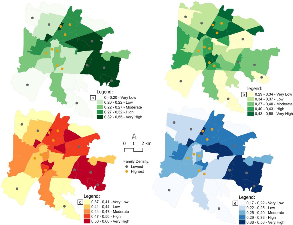 In secondo luogo, costruisce due indici compositi di vulnerabilità, un Indice di Vulnerabilità Socio-Economica (SEVI) e un Indice di Vulnerabilità Ambientale (EVI), e li combina con l’idoneità dei tetti per produrre mappe di priorità ponderate per l’equità a livello delle 40 unità urbane di Padova (aree amministrative sub-comunali).