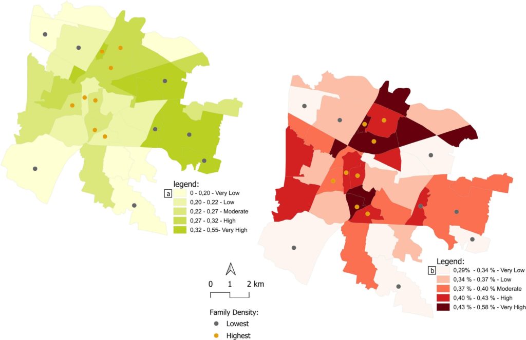 La densità familiare è rappresentata dal primo e dal quinto quantile (il più basso in grigio; il più alto in arancione).